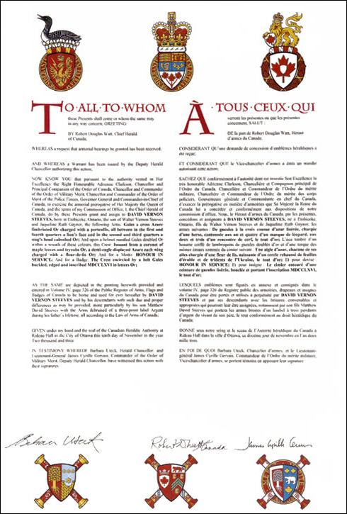 Additional InformationCreator(s)Original concept of Robert D. Watt, Chief Herald of Canada, assisted by the Heralds of the Canadian Heraldic Authority PainterEva Pilar-Cass CalligrapherKaren Mackay Recipient TypeIndividual |