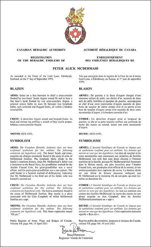 Arms of Peter Alick McDermaidBlazonGules on a fess between in chief a cross-crosslet flanked by two boars’ heads Argent armed Or and in base a like boar’s head flanked by two cross-crosslets Argent, a celestial crown Sable its stars Or between two lymphads Sable, sails unfurled and flagged Gules, all within a bordure invected Or; SymbolismThe Canadian Heraldic Authority does not have confirmed symbolism for this emblem. The following comments are hypotheses only. The boars’ heads and cross-crosslets are charges commonly found in the coats of arms of McDermaid families. The lymphads likely allude to the family’s maritime history, since Mr. McDermaid’s father was a lieutenant in the Royal Navy, his grandfather worked for the Anchor Cunard Line, his great-grandfather was a naval officer, and his great-great-grandfather was a sea captain. The gold border is a Scottish method of differencing, indicating that Mr. McDermaid is the third son of his father, who was himself a second son. |