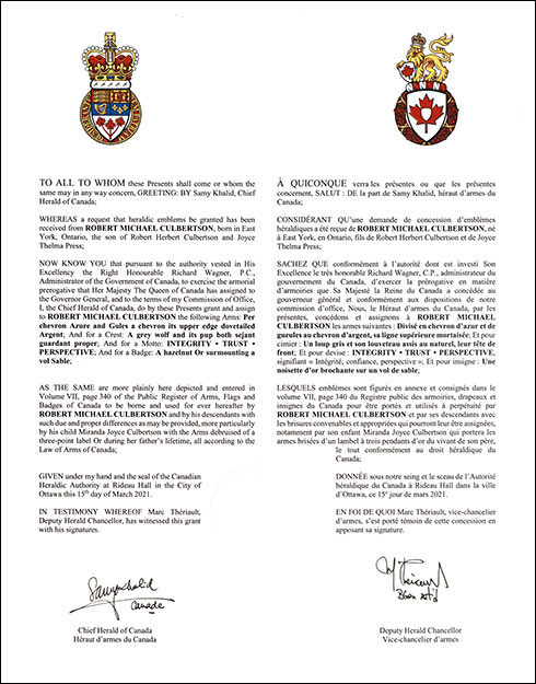 The contents of this Register are intended for research purposes only. The heraldic emblems found in the Register may not be reproduced in any form or in any media without the written consent of the Canadian Heraldic Authority and/or the recipient.