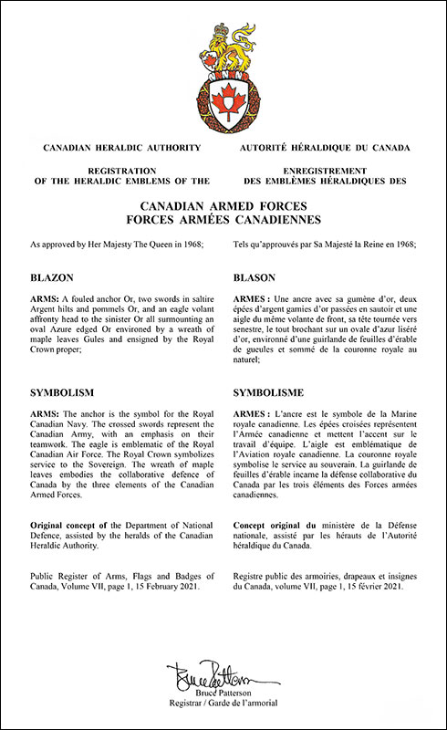The contents of this Register are intended for research purposes only. The heraldic emblems found in the Register may not be reproduced in any form or in any media without the written consent of the Canadian Heraldic Authority and/or the recipient.