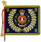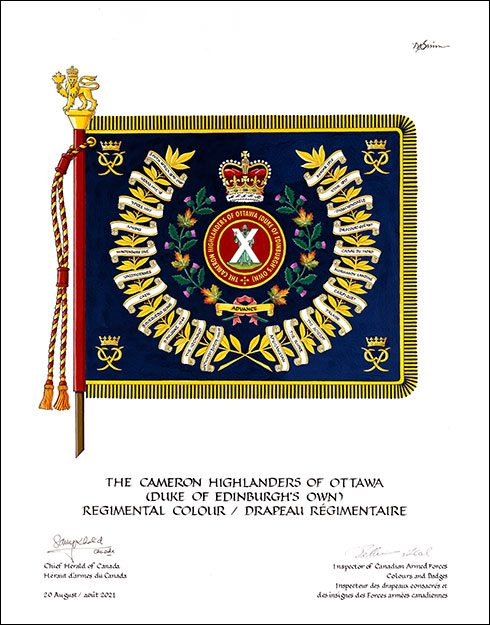 Flag of The Cameron Highlanders of Ottawa (Duke of Edinburgh's Own)BlazonAzure a torteau charged with a figure of Saint Andrew standing on a bed of rue proper and holding a saltire couped Argent, all within an annulus Gules edged and inscribed THE CAMERON HIGHLANDERS OF OTTAWA (DUKE OF EDINBURGH’S OWN) in letters Or, ensigned by the Royal Crown proper and environed by two branches of autumnal maple leaves and thistles their stems in saltire proper bound by a ribbon Gules surmounted by a scroll Or inscribed ADVANCE in letters Sable, the whole environed by two laurel branches their stems in saltire Or fructed Gules bearing scrolls Argent edged Or inscribed in letters Sable on the dexter with SOUTH AFRICA, 1899 - 1900; ARRAS, 1917, ’18; YPRES, 1917; AMIENS; HINDENBURG LINE; VALENCIENNES; CAEN; BOURGUÉBUS RIDGE; BOULOGNE, 1944; THE HOCHWALD; NORTH-WEST EUROPE, 1944 - 45; and on the sinister with SOMME, 1916; VIMY, 1917; PASSCHENDAELE; DROCOURT-QUÉANT; CANAL DU NORD; NORMANDY LANDING; CARPIQUET; FALAISE; THE SCHELDT; THE RHINE; AFGHANISTAN; all cantoned between the cypher Or of His Royal Highness The Prince Philip, Duke of Edinburgh; SymbolismAs an infantry regiment, The Cameron Highlanders of Ottawa (Duke of Edinburgh’s Own) uses as its Regimental Colour a blue flag with a form of the regimental badge set on a red background at its centre. The crown and maple leaves represent service to the Sovereign and to Canada. The thistles are common motifs among badges of Canadian highland infantry regiments. The laurel branches are symbols of victory. The scrolls display select battle honours awarded to the regiment. The cypher of His Royal Highness The Prince Philip, Duke of Edinburgh, alludes to the name of the Regiment. |
