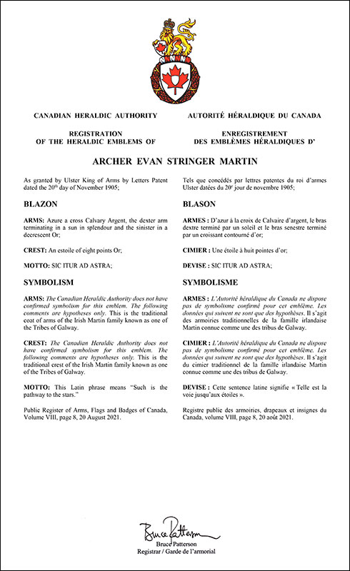 Arms of Archer Evan Stringer MartinBlazonAzure a cross Calvary Argent, the dexter arm terminating in a sun in splendour and the sinister in a decrescent Or; SymbolismThe Canadian Heraldic Authority does not have confirmed symbolism for this emblem. The following comments are hypotheses only. This is the traditional coat of arms of the Irish Martin families. |