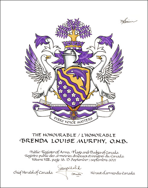 Arms of Brenda Louise MurphyBlazonPer bend wavy Or and Purpure, a bend wavy counterchanged between in chief an orca enarched Purpure embellished Argent and in base semé of mayflowers Argent seeded Or; SymbolismPurple—or lavender—symbolizes Her Honour’s defence of women’s rights, her fight against domestic violence and her belonging to the LGBTQ+ community. For her, gold stands for life and enlightenment. White represents snow and her love of snowshoeing and other winter activities. The wavy stripes allude to the Saint John River (Wolastoq), near which she has always lived. For her, water has important healing powers. Seen off the coast of New Brunswick, the orca is a member of a matriarchal society with a highly-developed structure and culture, symbolizing Her Honour’s social activism as well as her management and communication skills. Furthermore, the orca’s strength and fighting prowess conjure the image of a “sea warrior” and embody her surname Murphy, which is derived from two Irish words, muir meaning “sea” and cath meaning “battle.” The mayflower shrub is native to eastern North America and is her favourite flower. It blooms in clusters under grass and fallen leaves; for her, it symbolizes the necessity of looking beyond appearances to find truth and beauty. |