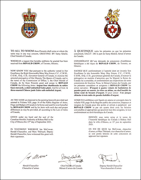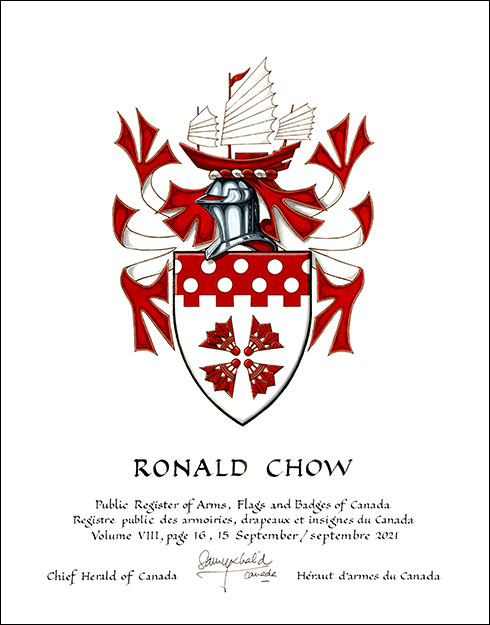 Arms of Ronald ChowBlazonArgent four shuttlecocks in saltire bases inwards, a chief embattled Gules platé; SymbolismThe red and white colours, as well as the crenellation, are taken from the coat of arms of the former British colony of Hong Kong to highlight Mr. Chow’s family ties to the city during the colonial period. Red and white are also the colours of Canada, the country to which Mr. Chow’s grandparents immigrated. Furthermore, the white crenellated section alludes to a battlement and symbolizes Mr. Chow’s professional vocation as a doctor to protect his patients’ health. The disks on the red portion allude to white blood cells, therefore evoking Mr. Chow’s particular interest in epidemiology and medical research. The shuttlecocks represent Mr. Chow’s fondness for, and skill in, badminton. They are laid out in the shape of a wheel to symbolize time and serve as a cautionary reminder of our mortality in a time of scientific progress. The empty spaces between the shuttlecocks form a cross, thus representing Mr. Chow’s Christian faith. |