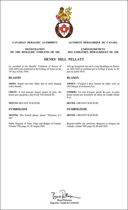 The contents of this Register are intended for research purposes only. The heraldic emblems found in the Register may not be reproduced in any form or in any media without the written consent of the Canadian Heraldic Authority and/or the recipient.