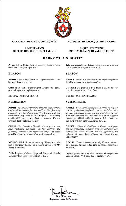 Arms of Harry Worts BeattyBlazonAzure a fess embattled Argent masoned Sable between three pheons Or; SymbolismThe Canadian Heraldic Authority does not have confirmed symbolism for this emblem. The following comments are hypotheses only. The fortress wall and arrowheads may refer to the Siege of Londonderry (1688-1689), where Mr. Beatty’s ancestor Captain William Beatty defended the city. |