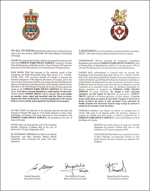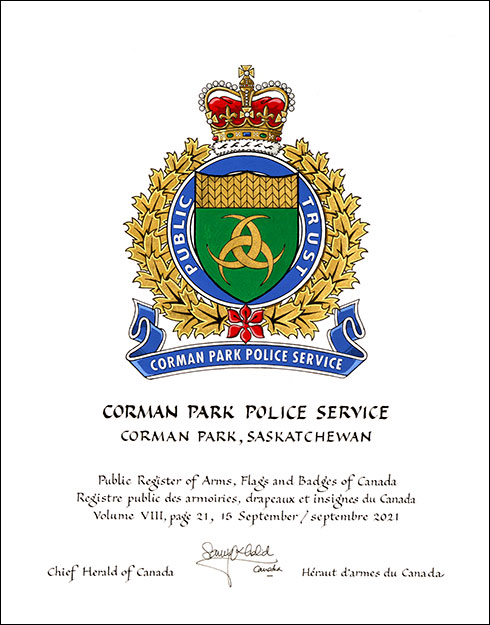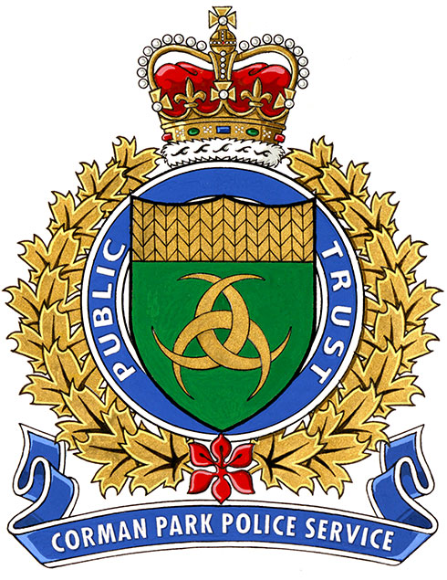 Badge of the Corman Park Police ServiceBlazonThe Arms within an annulus Azure edged and inscribed with the Motto in letters Argent, the whole environed by a wreath of maple leaves Or issuant from a western red lily and ensigned by the Royal Crown proper; SymbolismThe design follows the traditional structure of a municipal police badge. The Royal Crown indicates that the officers of the Service enforce the Queen’s peace and the justice of the Crown. The western red lily is the provincial flower of Saskatchewan, and the maple leaves symbolize Canada. |