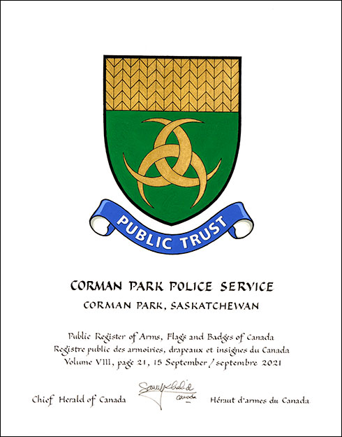 Arms of the Corman Park Police ServiceBlazonVert three crescents interlaced, a chief tapissé of wheat Or; SymbolismGold and green are the provincial colours of Saskatchewan. The gold wheat pattern represents the verdant agriculture of the municipality. Each crescent stands for the C in Corman, and the three of them indicate that three municipalities were amalgamated to create the Rural Municipality of Corman Park in 1970. |