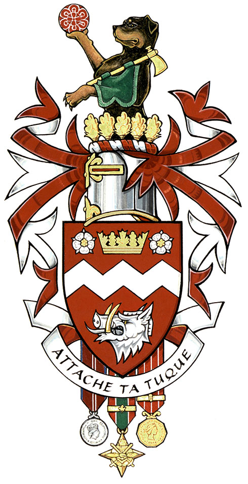 CrestBlazonA demi-Rottweiler proper issuant from a circlet of hackles holding in its dexter paw a torteau charged with a mandala Argent and supporting in its sinister leg a pipe tomahawk Or pendent therefrom a pipe banner Vert; SymbolismThe dog evokes the Ruggle family’s long-time ownership of Rottweiler dogs. The pipe tomahawk, containing symbols of war and peace, recalls that LCol Ruggle presented such items as distinctively Canadian gifts to foreign dignitaries during peace support operations when he was deployed in Afghanistan. The gold hackles are part of the uniform of the Lorne Scots. The pipe banner is an item that contains the personal heraldic emblems of a regiment’s commanding officer. The geometric design is a mandala, often used for meditative purposes, and evokes the Indian heritage of his late wife Sarika Sehgal. |