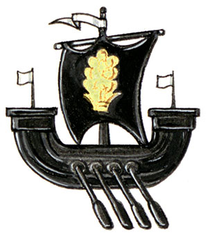Badge of Thomas Andrew RuggleBlazonA lymphad oars in action Sable flags and pennon Argent the sail Sable charged with a hackle Or; SymbolismThe lymphad is found in the arms of the Duke of Argyll and is used in the camp flag of the Lorne Scots. The gold hackle is worn in the headgear of each soldier of the regiment. |