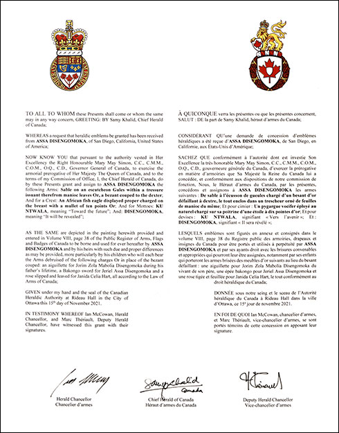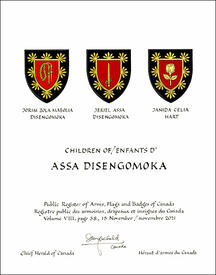 Grant of Arms, with differences to Jorim Zola Mabolia Disengomoka, Jeriel Assa Disengomoka and Janida Celia Hart