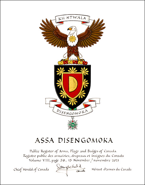 MottoBlazonDISENGOMOKA; SymbolismMeaning “It will be revealed,” this Kikongo phrase became a family name. Using it as his motto, Mr. Disengomoka expresses his pride in his name, in his family’s history, and in the Congolese tradition of giving names that are meaningful and that define family identity. |