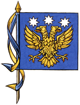Flag of Brian Boyd BrazeauBlazonA standard, the Arms in hoist, the fly Argent charged with the Badge between two representations of the Crest, all separated by two bends sinister Argent fimbriated and inscribed with the Motto in letters Azure; SymbolismThe symbolism of this emblem is found in other element(s) of this record. |