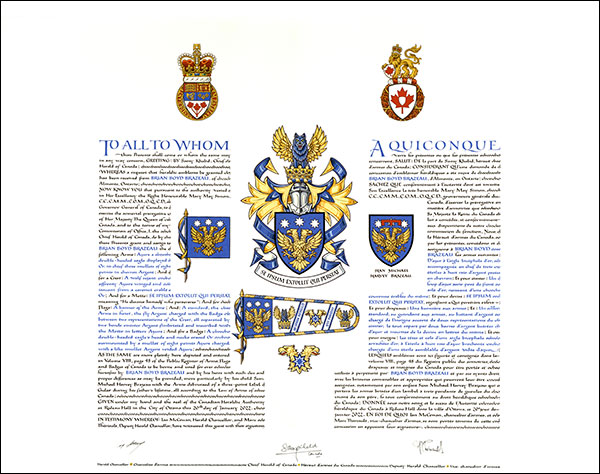 Arms of Brian Boyd BrazeauBlazonAzure a double-headed eagle displayed Or, in chief three mullets of eight points in chevron Argent; SymbolismBlue symbolizes the Ottawa River and its tributaries that give life to the lands in the Ottawa Valley, where Mr. Brazeau’s family has lived for generations. Gold alludes to the agricultural heritage of both sides of his family and that of his spouse’s. White, which combines all hues of the visible light spectrum, embodies for him the totality of life’s experiences. The double-headed eagle represents Mr. Brazeau’s belief in looking to both the past and the future in order to “take flight” and achieve great things. The three stars stand for his family’s past, present and future, marking the passing generations with their struggles and successes. |