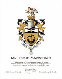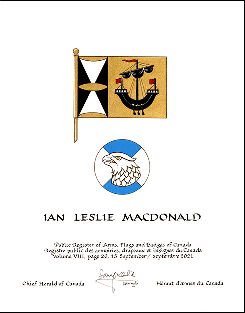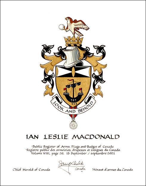 Arms of Ian Leslie MacdonaldBlazonOr a lymphad sails furled oars in action Sable flagged Gules, on a chief per saltire Sable and Argent a vesica piscis between two flaunches Or; SymbolismThe black ship on gold is common to Macdonald coats of arms as an indication of the historical title of Lord of the Isles. For Mr. Macdonald, it represents the various Scottish isles on which his ancestors were born, as well as the emigration of his ancestors from Scotland to Canada. The oval, triangles, and semi-ovals illustrate the physics of light refracted through a lens, and how an image is captured through the eyes. They symbolize Mr. Macdonald’s work as a renowned photographer, having been commissioned several times by Her Majesty The Queen. |