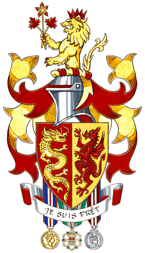MottoBlazonJE SUIS PRÊT; SymbolismThis French phrase, meaning “I am ready,” refers to Mr. Louie’s readiness to serve his community and family. It is a variant on the motto of Simon Fraser University, Nous sommes prêts (“We are ready”). |
