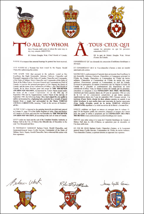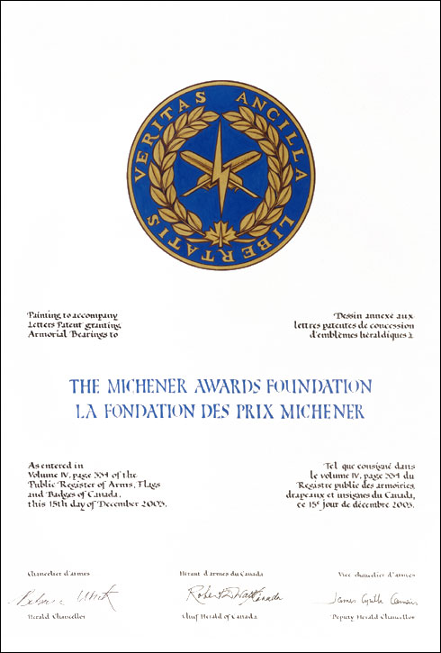 Badge of The Michener Awards FoundationBlazonOn a hurt edged Or, two quills in saltire surmounted by a lightning bolt, encircled by a wreath of laurel issuant from a maple leaf surrounded by the Motto VERITAS ANCILLA LIBERTATIS, all Or; SymbolismBlue and gold honour the late Rt. Hon. Roland Michener, founder of the award, through use of the principal colours of his coat of arms. Excellence of achievement is symbolized through the use of the laurel wreath, while the quill pens and the lightning bolt represent communication through writing and electronic means. The maple leaf underlines the fact that this is a Canadian award and the recipients are and serve Canadians. |