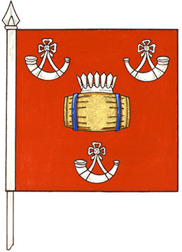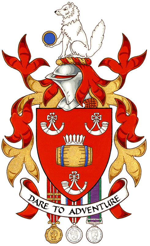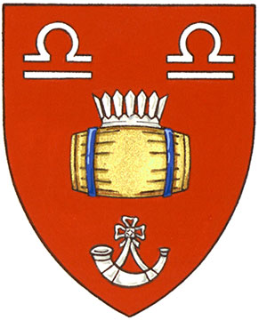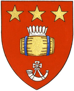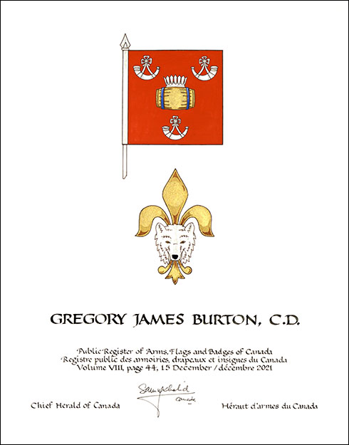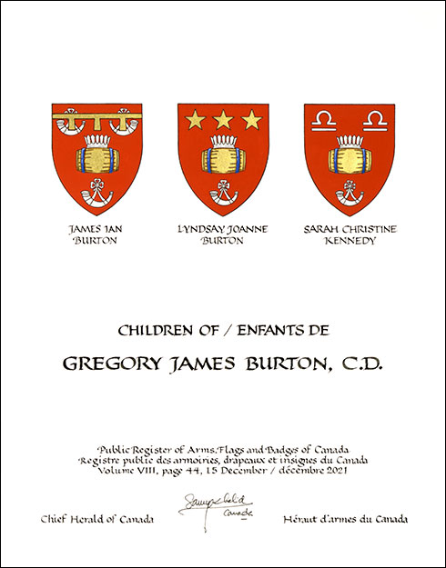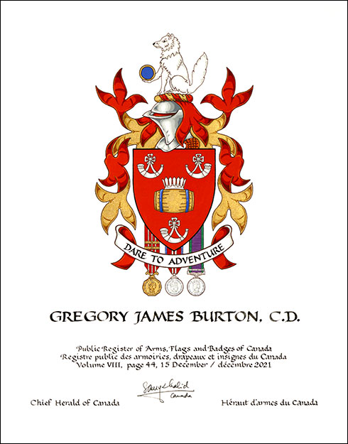 Arms of Gregory James BurtonBlazonGules a tun Or hooped Azure ensigned by a palisado crown between three hunting horns those in chief addorsed Argent; SymbolismRed is the colour of the Canadian and British Armies in which Mr. Burton served. The coronet and barrel are a canting reference to his surname, burh meaning “fort” in old English (represented by the coronet shaped like a palisade) and “tun” referring to a large cask. The cask is also an important symbol for his family, because many of its members have worked in the cooper trade. Gold alludes to Mr. Burton’s love of scotch. The horns, made from an animal’s weapons, represent the three infantry regiments in which Mr. Burton served. |