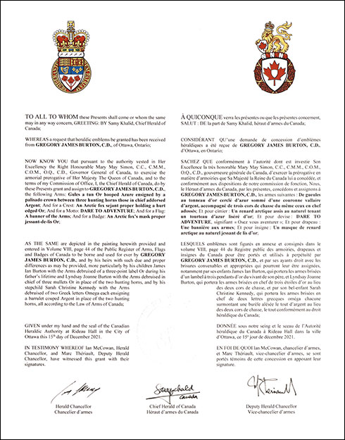 The contents of this Register are intended for research purposes only. The heraldic emblems found in the Register may not be reproduced in any form or in any media without the written consent of the Canadian Heraldic Authority and/or the recipient.