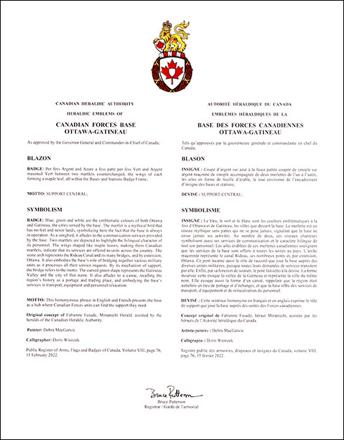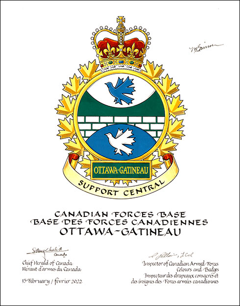Badge of Canadian Forces Base Ottawa-GatineauBlazonPer fess Argent and Azure a fess patté per fess Vert and Argent masoned Vert between two martlets counterchanged, the wings of each forming a maple leaf, all within the Bases and Stations Badge Frame; SymbolismBlue, green and white are the emblematic colours of both Ottawa and Gatineau, the cities served by the base. The martlet is a mythical bird that has no feet and never lands, symbolizing here the fact that the base is always in operation. As a songbird, it alludes to the communication services provided by the base. Two martlets are depicted to highlight the bilingual character of its personnel. The wings shaped like maple leaves, making them Canadian martlets, indicate that its services are offered to units across the country. The stone arch represents the Rideau Canal and its many bridges, and by extension, Ottawa. It also embodies the base’s role of bridging together various military units as it processes all their service requests. By its mechanism of support, the bridge refers to the motto. The curved green shape represents the Gatineau Valley and the city of that name. It also alludes to a canoe, recalling the region’s history as a portage and trading place, and embodying the base’s services in transport, equipment and personnel relocation. |