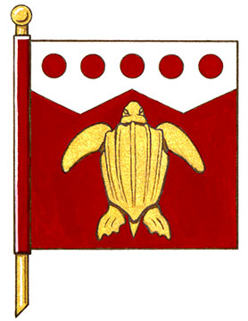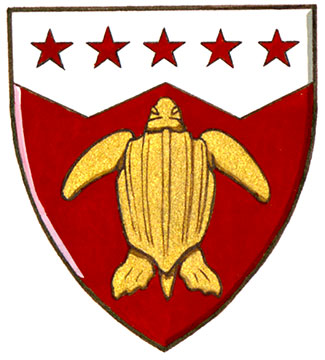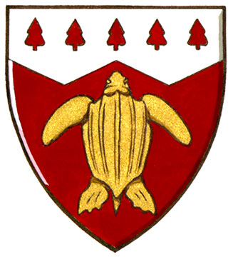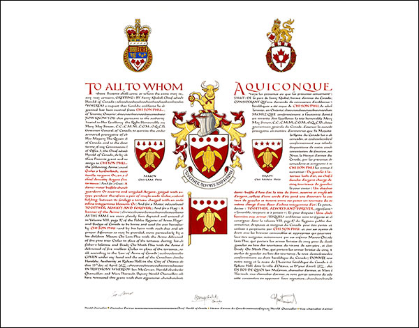 Arms of Chi Son PhuBlazonGules a leatherback turtle tergiant Or, on a chief dancetty Argent five torteaux; SymbolismRed and white are found on the flag of Canada, Mr. Phu’s country of birth. Gold symbolizes luck, happiness and prosperity. Known for its unusually long annual migrations, the leatherback turtle alludes to the lengthy and arduous journey to Canada made by Mr. Phu’s parents, who were Vietnamese boat people and whose experience shaped his outlook on the world. The migratory behaviour of the leatherback turtle evokes adventures, and thus Mr. Phu’s interest in travelling. The turtle also stands for Kim Quy, one of the four sacred animals of Vietnamese mythology. As such, it symbolizes strength, freedom and peace, which is what Mr. Phu’s family found in Canada. The discs allude to plates and represent his career as a restaurateur and entrepreneur. The jagged line alludes to mountains, making a visual reference to his given name Chi Son, which means “mountain” in Vietnamese. |