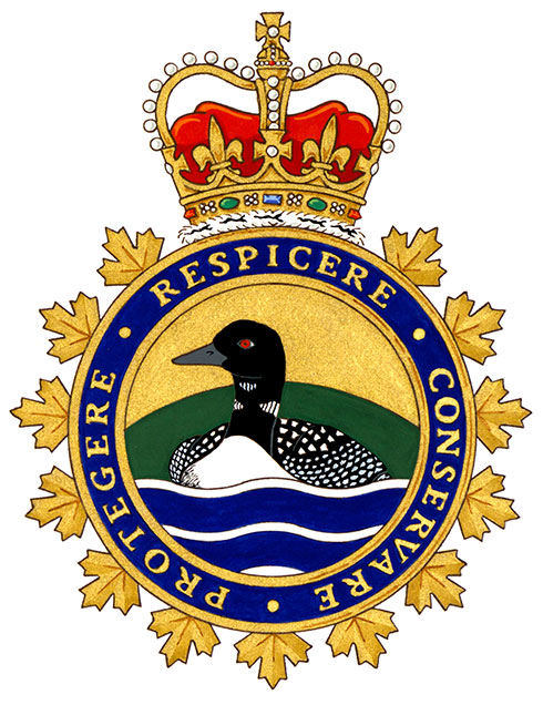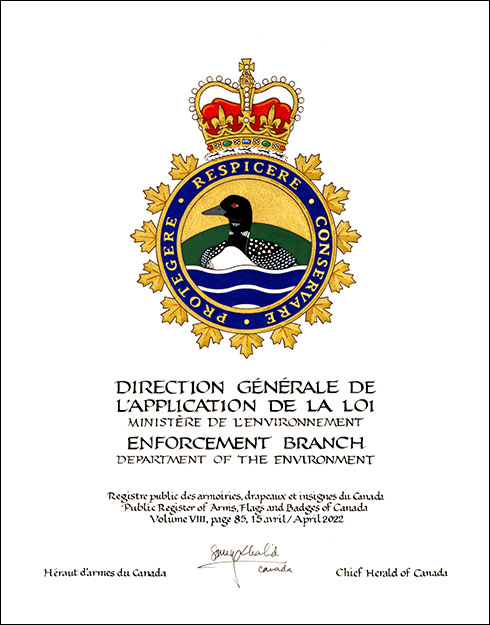 Badge of the Department of the Environment of the Government of CanadaBlazonA roundel per fess enarched Or and Vert overall a loon proper naiant on a base wavy Argent charged with two bars wavy, all within an annulus Azure fimbriated, inscribed with the Motto, cotised by demi-maple leaves Or and ensigned by the Royal Crown proper; SymbolismThe golden upper section represents a bright sunny sky; the green section, a wooded landscape; and the blue and white wavy section, water. The loon stands for all Canadian wildlife. Together, these elements symbolize respectively air, land, water and wildlife, the four spheres monitored by the Enforcement Branch in its mission to ensure that the laws administered by the Department of the Environment are respected. The maple leaves represent Canada and its provinces and territories, alluding to the geographical scope and the outreach programs of the Branch. The Royal Crown indicates its role in the administration of the law. |