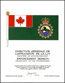 Flag of the Department of the Environment of the Government of CanadaBlazonVert in the fly the Badge, a canton of the National Flag of Canada fimbriated Argent; SymbolismGreen, a colour that is frequently associated with the environment, is found on the uniform worn by the officers of the Enforcement Branch. The National Flag indicates service to Canadians. The emblem in the fly is the Badge of the organization. |