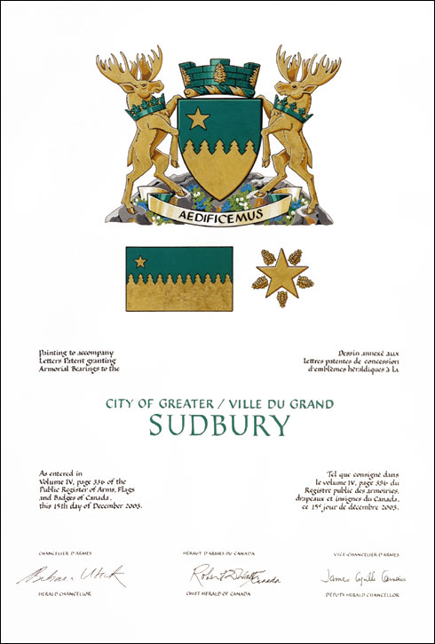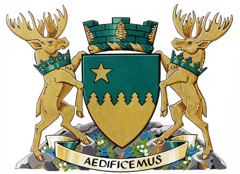 SupportersBlazonTwo moose Or, that to the dexter gorged with a coronet erablé, that to the sinister gorged with a coronet fleurdelisé Vert, both standing on a rocky mount set with blueberry plants proper; SymbolismThe moose are animals symbolic of Northern Ontario. The rocky compartment, itself indicative of the strong and enduring foundations on which the community has been built, indicates the importance of mining in the area, and the blueberries are a distinctive feature of local vegetation. The coronets indicate the diverse Canadian and francophone heritage of the City. |
