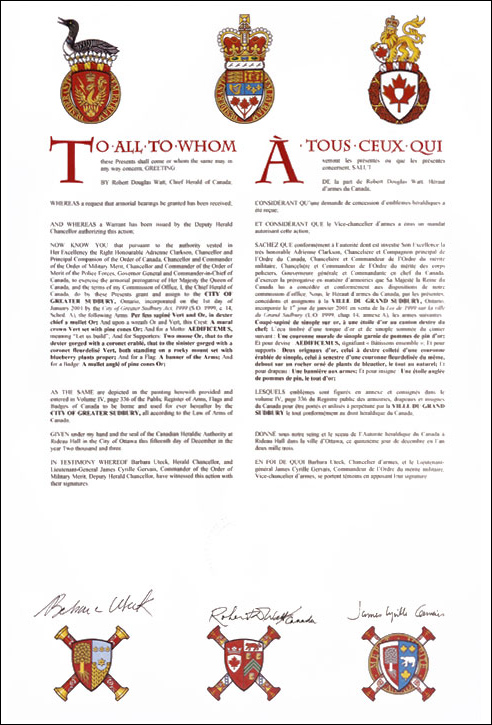 Additional InformationCreator(s)Original concept of Bruce Patterson, Saguenay Herald, assisted by the Heralds of the Canadian Heraldic Authority PainterLinda Nicholson CalligrapherNancy Ellis Recipient TypeCivil Institution