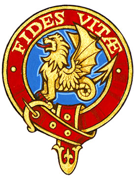 Badge of Frédéric BernierBlazonA hurt charged with a winged lion-wyvern statant Or within a belt Gules edged buckled and inscribed FIDES VITÆ Or; SymbolismThe winged lion-wyvern beast alludes to the creatures on the Arms and symbolizes the perpetual struggle between the courage to follow one’s convictions and the lure of personal gain. The Latin expression on the belt means “Trust in life.” |