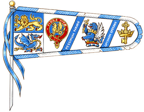 Flag of Frédéric BernierBlazonA standard, the Arms in hoist, the fly Argent charged with the second Badge, the Crest and the first Badge, all separated by two bends sinister Azure inscribed with the Motto in letters Argent; SymbolismThe symbolism of this emblem is found in other element(s) of this record. |