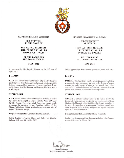 Additional InformationCreator(s)Original concept of the Canadian Heraldic Authority. PainterCanadian Heraldic Authority / Autorité héraldique du Canada CalligrapherNot applicable Recipient TypeRoyal Family Other InformationAs approved by His Royal Highness on the 11th day of April 2022; |