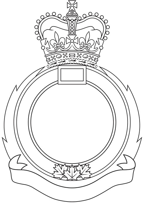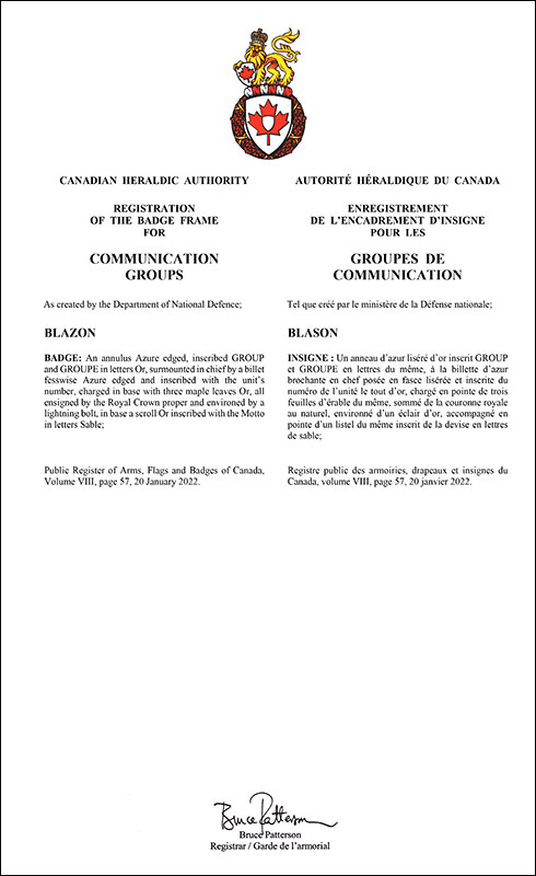 Badge Frame for Communication Groups of the Canadian Armed ForcesBlazonAn annulus Azure edged, inscribed GROUP and GROUPE in letters Or, surmounted in chief by a billet fesswise Azure edged and inscribed with the unit’s number, charged in base with three maple leaves Or, all ensigned by the Royal Crown proper and environed by a lightning bolt, in base a scroll Or inscribed with the Motto in letters Sable; SymbolismMost badges of the Canadian Armed Forces are enclosed within badge frames to permit quick visual identification of a unit's type and function. This is one of the badge frames used as part of the primary badges. |