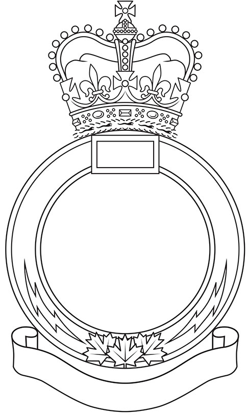 Badge Frame for Communications Squadrons of the Canadian Armed ForcesBlazonAn annulus Azure edged and inscribed SQUADRON and ESCADRON Or surmounted in chief by a billet fesswise Azure edged and inscribed with the unit’s number, charged in base with three maple leaves between two lightning bolts Or, all ensigned by the Royal Crown proper, in base a scroll Or inscribed with the Motto in letters Sable; SymbolismMost badges of the Canadian Armed Forces are enclosed within badge frames to permit quick visual identification of a unit's type and function. This is one of the badge frames used as part of the primary badges. |