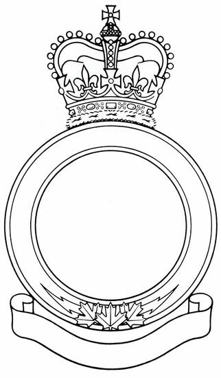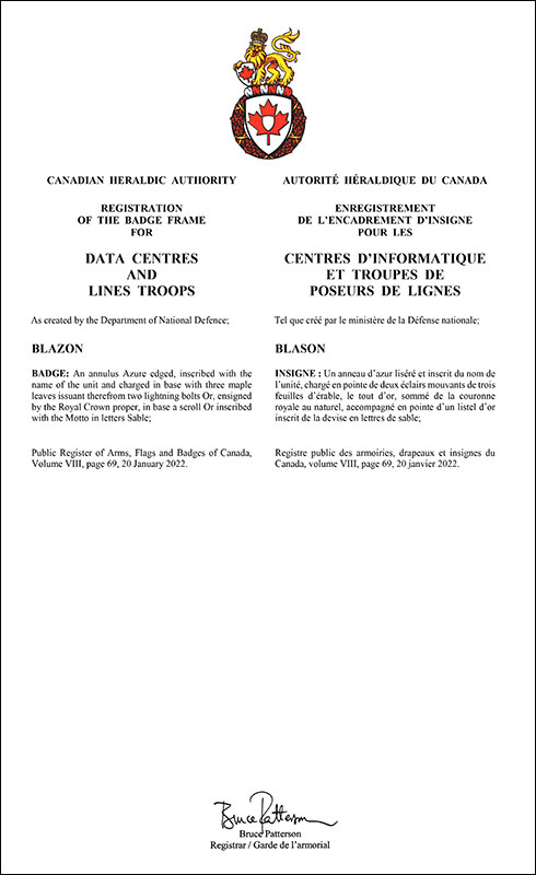 Badge Frame for Data Centres and Lines Troops of the Canadian Armed ForcesBlazonAn annulus Azure edged, inscribed with the name of the unit and charged in base with three maple leaves issuant therefrom two lightning bolts Or, ensigned by the Royal Crown proper, in base a scroll Or inscribed with the Motto in letters Sable; SymbolismMost badges of the Canadian Armed Forces are enclosed within badge frames to permit quick visual identification of a unit's type and function. This is one of the badge frames used as part of the primary badges. |