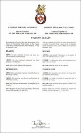 Arms of Vincent ClearyBlazonPer pale embattled Erminois and Gules two lions combatant counterchanged; SymbolismThese arms have long been in unofficial use by Mr. Cleary’s family. |
