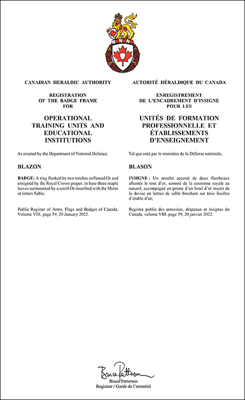 Badge Frame for Schools and Training Centres of the Canadian Armed ForcesBlazonA ring flanked by two torches enflamed Or and ensigned by the Royal Crown proper, in base three maple leaves surmounted by a scroll Or inscribed with the Motto in letters Sable; SymbolismMost badges of the Canadian Armed Forces are enclosed within badge frames to permit quick visual identification of a unit's type and function. This is one of the badge frames used as part of the primary badges. |