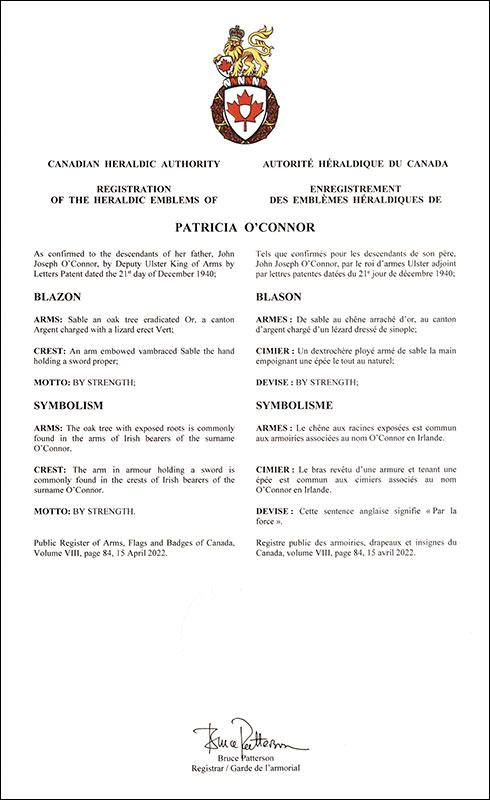 Arms of Patricia O'ConnorBlazonSable an oak tree eradicated Or, a canton Argent charged with a lizard erect Vert; SymbolismThe oak tree with exposed roots is commonly found in the arms of Irish bearers of the surname O’Connor. |