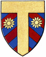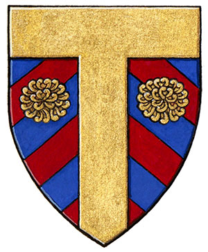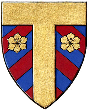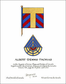 Arms of Albert Dennis ThomasBlazonChevronny Azure and Gules a chief-pale Or; SymbolismThe “T” shape symbolizes a steel T-beam, representing Mr. Thomas’s career as an engineer, as well as alluding to the initial of his surname. Each of the three pairs of inverted V-shapes alludes to the girders that help to reinforce T-beams. Blue and maroon are the colours of Mr. Thomas’s high school and university respectively. The combination of blue and gold is used by the 758 Argus Royal Canadian Air Cadet Squadron, where Mr. Thomas volunteers. |