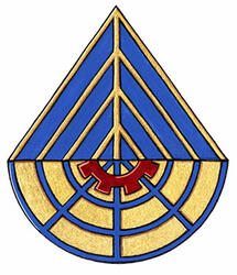 Badge of Albert Dennis ThomasBlazonA triangle Azure charged with a tower and cables of a cable-stayed bridge Or conjoined in base with a half-disc protractor Or embellished Azure charged with a demi-cogwheel issuant in chief Gules; SymbolismThe symbolism of this emblem is found in other element(s) of this record. |
