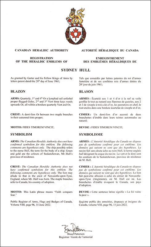 Arms of Sydney HullBlazonQuarterly, 1st and 4th Or a lymphad sail unfurled proper flagged Gules, 2nd and 3rd Vert three keys wards upwards Or, all within a bordure quarterly Vert and Or; SymbolismThe Canadian Heraldic Authority does not have confirmed symbolism for this emblem. The following comments are hypotheses only. The ship possibly refers to the name Hull, the term for the body of a ship. Green and gold are the colours of Saskatchewan, Mr. Hull’s province of residence. |