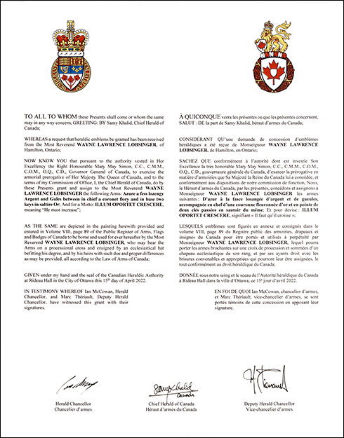 The contents of this Register are intended for research purposes only. The heraldic emblems found in the Register may not be reproduced in any form or in any media without the written consent of the Canadian Heraldic Authority and/or the recipient.