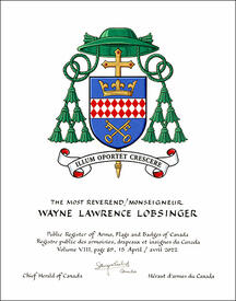 Arms of Wayne Lawrence LobsingerBlazonAzure a fess lozengy Argent and Gules between in chief a coronet flory and in base two keys in saltire Or; SymbolismThe red and white lozenges allude to the coat of arms of the Diocese of Hamilton, of which Bishop Lobsinger is the Auxiliary Bishop. The criss-cross pattern formed by the lozenges refers to the gridiron attribute of St. Lawrence, Bishop Lobsinger’s patron saint. Red and white are the colours of Canada and therefore allude to his country of origin and service. The coronet evokes the Cathedral Basilica of Christ the King in Hamilton where he was ordained to the priesthood and the episcopate. The fleur-de-lis shapes, as well as the blue background colour, refer to the Blessed Virgin Mary, to whom he has a particular devotion. The crossed keys symbolize St. Peter and thus St. Peter’s Seminary in London, Ontario, where Bishop Lobsinger studied and later served as Spiritual Director. |