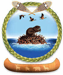 Badge of the Huron-Wendat NationBlazonA roundel Bleu Céleste charged with a beaver contourné gnawing on an aspen branch and sejant on a lodge issuant from a base of water, in chief three Canada geese volant contourné, the whole within a wreath of sweetgrass, surmounted in chief by two snowshoes in saltire and set above a canoe carved thereon a deer at gaze, a turtle naiant, a bear ambulant and a wolf statant ululant, all proper; SymbolismThe beaver, an emblem long used by the Hurons, symbolizes work, endurance, intelligence and pride; it also represents the Huron-Wendat Nation and its ability to adapt to its environment. The lodge evokes the community and its strength. The Canada geese recall the story of the creation of the world, in which the geese came to the aid of Aataentsic, the mother of humanity, caught her when she fell from the sky and placed her on the Great Turtle, which offered its shell as a place to live for all Indigenous peoples. The sweetgrass symbolizes spirituality, medicinal plants and the forest, essential elements for the Nation. The canoe and the snowshoes were traditional modes of transportation. The deer, turtle, bear and wolf are the emblems of four of the eight clans of the Nation. |