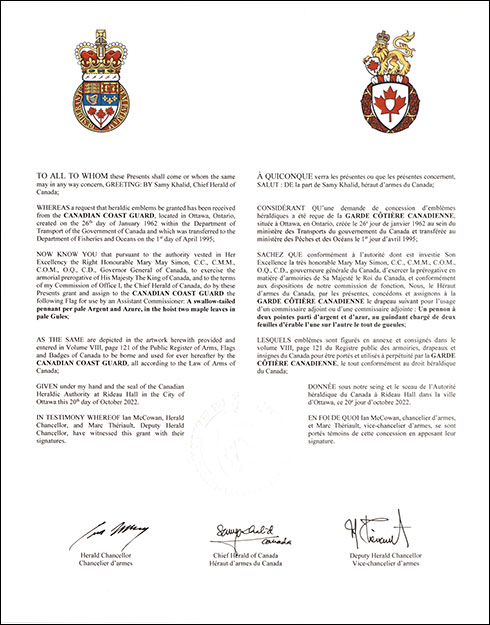 Additional InformationCreator(s)Original concept of the Canadian Coast Guard, assisted by the heralds of the Canadian Heraldic Authority. PainterKatherine Golightly CalligrapherKathy Feig Recipient TypeCivil Institution