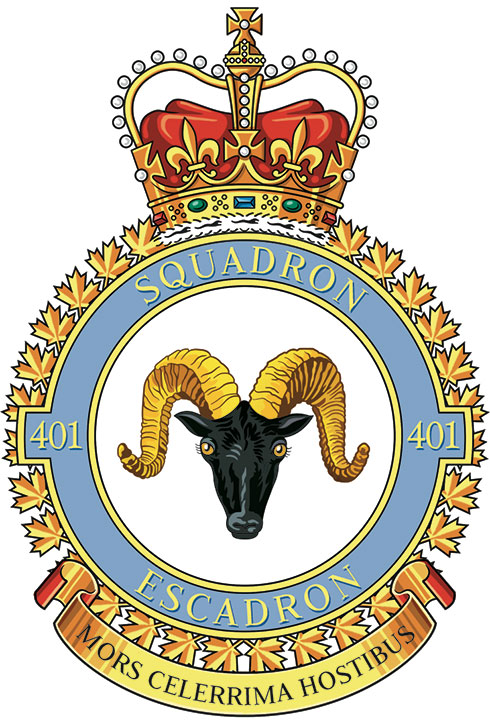 Badge of the 401 Tactical Fighter SquadronBlazonArgent a mountain sheep’s head caboshed Sable accorné Or, all within the Badge Frame for Flying Squadrons; SymbolismThe mountain sheep, indigenous to many parts of Canada, is known for its great stamina and fighting power. |