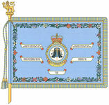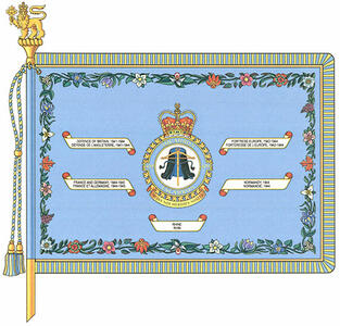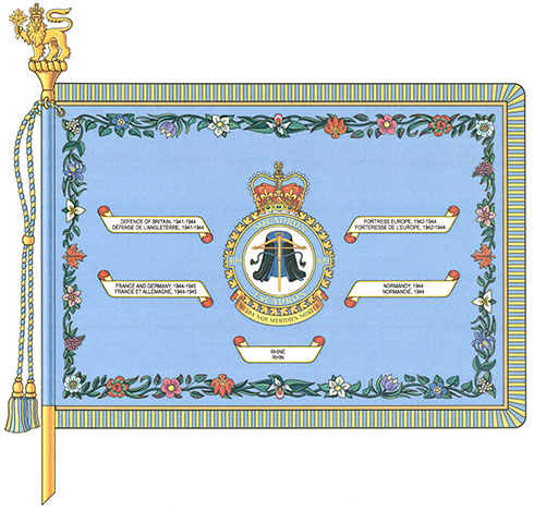 Flag of the 409 Tactical Fighter SquadronBlazonThe Standard for a Squadron of the Royal Canadian Air Force charged with the Badge of the 409 Tactical Fighter Squadron (Argent a cloak Sable its cord and lining Azure surmounted by a crossbow Or, all within the Badge Frame for Flying Squadrons, its scroll inscribed MEDIA NOX MERIDIES NOSTER), flanked by scrolls Argent inscribed in letters Sable, those to the dexter with DEFENCE OF BRITAIN, 1941-1944 / DÉFENSE DE L’ANGLETERRE, 1941-1944; FRANCE AND GERMANY, 1944-1945 / FRANCE ET ALLEMAGNE, 1944-1945; those to the sinister with FORTRESS EUROPE, 1942-1944 / FORTERESSE DE L’EUROPE, 1942-1944; NORMANDY, 1944 / NORMANDIE, 1944; and that in base with RHINE / RHIN; SymbolismThis flag is based on the pattern for standards for squadrons of the Royal Canadian Air Force, with the unit’s primary badge surrounded by the battle honours awarded to the unit. |