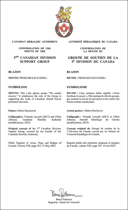 Additional InformationCreator(s)Original concept of the 3rd Canadian Division Support Group, assisted by the heralds of the Canadian Heraldic Authority. PainterDebra MacGarvie CalligrapherYolande Lessard Recipient TypeMilitary Institution |