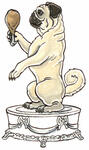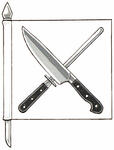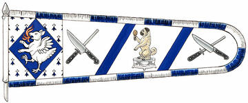 CrestBlazonA demi-pug proper holding the first Flag; SymbolismThe pug embodies Dr. Whibbs’ love for the breed, while also reflecting the Motto since these dogs in particular are known to love food. The chef’s knife and steel further symbolize his profession as a food historian. |