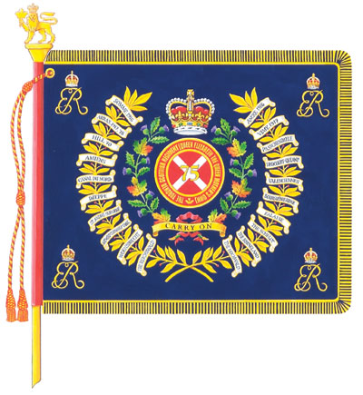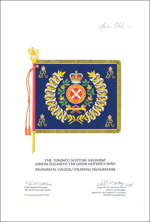 Regimental Colour of The Toronto Scottish Regiment (Queen Elizabeth The Queen Mother's Own)BlazonAzure a torteau charged with a saltire Argent surmounted by the numeral 75 Or, within an annulus Gules edged, charged in base with a thistle, inscribed THE TORONTO SCOTTISH REGIMENT (QUEEN ELIZABETH THE QUEEN MOTHER'S OWN) in letters Or, ensigned by the Royal Crown and enclosed by two branches of maple leaves in autumnal tints and thistles proper bound by a riband Gules surmounted by a scroll Or inscribed with the Motto CARRY ON in letters Sable, the whole enclosed by two branches of laurel Or fructed Gules each surmounted by ten scrolls Argent edged Or, those to the dexter inscribed in letters Sable SOMME, 1916; ARRAS, 1917, '18; HILL 70; AMIENS; CANAL DU NORD; DIEPPE; ST. ANDRÉ-SUR-ORNE; ANTWERP-TURNHOUT CANAL; WOENSDRECHT; and THE REICHSWALD; those to the sinister inscribed in letters Sable ANCRE, 1916; VIMY, 1917; PASSCHENDAELE; DROUCOURT-QUÉANT; VALENCIENNES; BOURGUÉBUS RIDGE; FALAISE THE SCHELDT; THE RHINELAND; and THE HOCHWALD; all between four representations of the Royal Cypher of Her Late Majesty Queen Elizabeth the Queen Mother Or, its Royal Crown proper; SymbolismNot applicable |